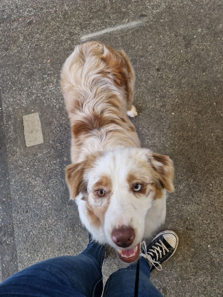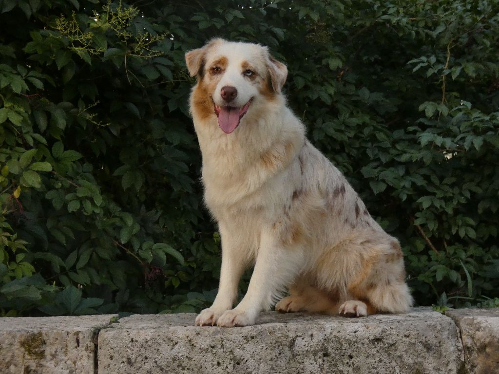 DCC bleu merle Bien proportionné Excellente poitrine et poitrail Ossature moyenne Angulations correctes Encolures dégagée Un peu cambrée Tête bien proportionnée Excellent Crâne, Stop et museau Oeil en amande Belles oreilles attachées bas Légèrement panard à l?arrière Serre un peu à l?arrière Ouvre les coudes à l?avant Manque un peu d?amplitude